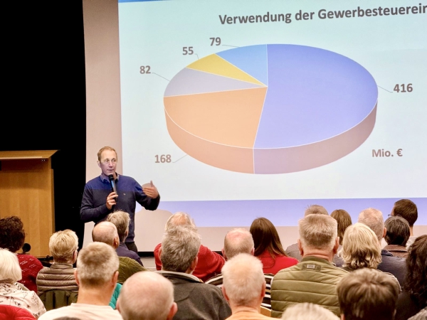 „Sobald die Gewerbesteuereinnahmen wieder steigen, können wir die erzielten Überschüsse wie in der Vergangenheit durch Steuer- und Gebührensenkungen an die Bürgerinnen und Bürger zurückgegeben“, versprach Risse. „Nach dem derzeitigen Stand der Planung wird das jedoch nicht vor 2029 möglich sein.