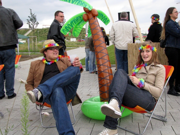 Um 18:20 Uhr laufen die Vorbereitungen hier bereits auf Hochtouren. Die Strandbar steht, die Kühltruhen sind befüllt und die Hawaiketten baumeln an unseren Hälsen. Auch ich bin ganz schön kribblig, muss ich zugeben. Max und Lisa blasen noch die letzten Plastikpalmen auf und verknoten sie mit den komfortablen Liegestühlen.