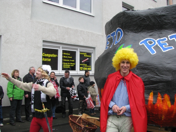 In so einem Umfeld geben sich auch die Politiker feierfreudig und mischen sich unters Narrenvolk. Während wir nun schon im siebten Jahr in Folge beim Rosenmontagszug dabei waren und auch Ursula Schlößer von der SPD einige Monheimer Karnevalsfeiern hinter sich hat, nahm Tim Brühland (CDU) zum ersten Mal am Spektakel teil. Er und seine rote Rivalin präsentierten sich jeweils auf einem eigenen Wagen dem närrischen Publikum und warben mit Schokolade bzw. Pralinen für sich und ihre Politik.