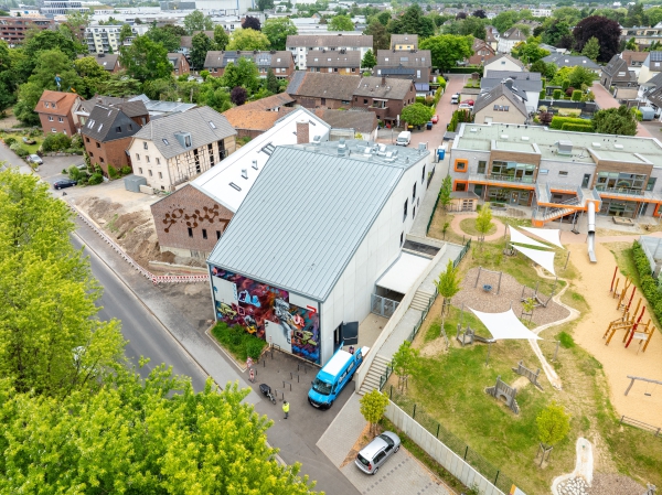 Das unter Denkmalschutz stehende und aufwändig restaurierte Fachwerkhaus aus dem Jahr 1787 ist ein Schmuckstück geworden und bietet den Sojus-7-Mitarbeitenden optimale Arbeitsräumlichkeiten. Büros mit Industriecharme in der ersten und zweiten Etage sind durch Glaswände in Metallrahmungen voneinander getrennt, wobei der große Mittelbereich im Erdgeschoss bis in die zweite Etage reicht und die Büros in der zweiten Etage über eine Galerie erreicht werden. Wo immer es möglich war, sind Naturmaterialien verbaut und die alten Balken mit eingearbeitet worden. An vielen Stellen sind sie von neuen Holzkonstruktionen gestützt. Kronkorken sind jeweils vor den Treppen als Markierungen für Menschen mit Sehbehinderung in den Beton eingelassen, jedes Geländer informiert durch kleine Metallschilder mit Blindenschrift über den Weg nach oben. Ein besonderes Highlight ist der Raum unter dem Dach, dessen Deckenkonstruktion aus alten und neuen Holzbalken besonders beeindruckt. Hier können größere Meetings stattfinden, auch kleinere Veranstaltungen wie Lesungen oder Vorträge sind möglich. Svenja Hein, die stellvertretende Leiterin des Sojus 7, berichtet von der zurückliegenden Verleihung des Jugendkulturpreises NRW 2025 im Juni, bei dem an dieser Stelle mit entsprechender Bestuhlung ein Film gezeigt werden konnte.