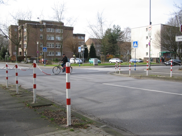 Um die Fußgänger und Radfahrer an der Hegelstraße vor den Autos zu schützen, forderten einige Baumberger die Ampel zurück. Raimund Elbers hätte sie bestellt, wenn er grünes Licht vom zuständigen Planungsausschuss bekommen hätte. Mit einer äußerst knappen Mehrheit entschieden sich CDU und FDP jedoch für die kostengünstige Kettenvariante. Dabei wurden der Überweg für Fußgänger und Radfahrer aus der Kreuzung heraus einige Meter in die Hegelstraße verlegt. Eine Kette verhindert seitdem das direkte Überqueren der Straße. Dass die Kette bleibt, bestätigte der Ausschuss nun noch einmal. Statt Geld in eine Ampel zu investieren, soll die Straße insgesamt umgestaltet werden, einige Verkehrsinseln und zur Berghausener Straße mittelfristig einen Kreisverkehr erhalten.