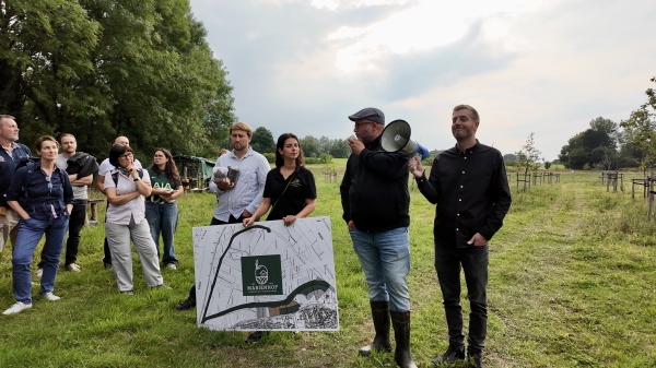 In Gummistiefeln erwartet der Marienburg-Betreiber Alexander Zimmer seine Gäste vor dem neuen High-Tech-Verkaufscontainer an der Bleer Straße. PETO30plus hat zu einem Themenabend mit einer Besichtigung des Marienhofes eingeladen und sehr viele Menschen aller Altersgruppen sind dieser Einladung gefolgt.