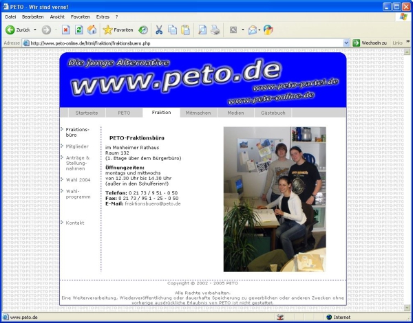 Auf ihrer Internetseite www.peto.de hat die Jugendpartei PETO jetzt einen eigenen Bereich für ihre Fraktion im Monheimer Stadtrat eingerichtet. Neben den Öffnungszeiten, der Telefonnummer und der E-Mail-Adresse des Fraktionsbüros lässt sich wie bisher eine Übersicht über alle Fraktionsmitglieder abrufen. Die Rats- und Ausschussmitglieder der PETO-Fraktion werden dort jeweils mit Foto und E-Mail-Adresse persönlich vorgestellt. Neu ist die Rubrik „Anträge und Stellungnahmen“, in der man mehr über die von der PETO-Fraktion gestellten Anträge erfahren kann. Stellungnahmen, Presse-Erklärungen und die bisherigen Haushaltsreden lassen sich ebenfalls nachlesen. Außerdem lässt sich weiterhin das Wahlprogramm zur Kommunalwahl 2004 herunterladen, in dem die Jugendpartei alle Punkte vorstellt, die sie sich bis 2009 politisch vorgenommen hat. Zu erreichen ist der Fraktionsbereich von der Startseite www.peto.de aus. Über das Navigationsmenü gelangt man mit dem Link „Fraktion“ direkt in den neuen Bereich.