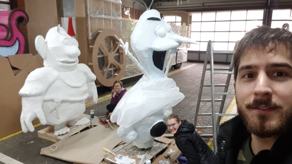 Gesagt getan: Schnell werden Schneemann Olaf und ein Steintroll aus Draht und Knochenleim zum Leben erweckt und bekommen einen Schlitten aus Holz. Danach ertönen für einige Wochen jeden Mittwoch, Freitag und Samstag die Geräusche von Sägen, Bohrmaschinen und Kompressoren. Es wird gehämmert, getackert und geschraubt. Doch was zu Beginn Spaß macht, kann nach einer Zeit auch anstrengend sein. Und was auf dem Papier einfach aussieht, ist in der Realität oft schwieriger als gedacht. „Da kommt es auch mal vor, dass man acht Stunden alleine arbeitet. Das zerrt an den Kräften“, erklärt Wagenbauer Andy. Doch zum Glück ist er in den Hallen der BSM nicht der einzige Wagenbaumeister mit diesem Schicksal und alle motivieren sich gegenseitig für den Endspurt.