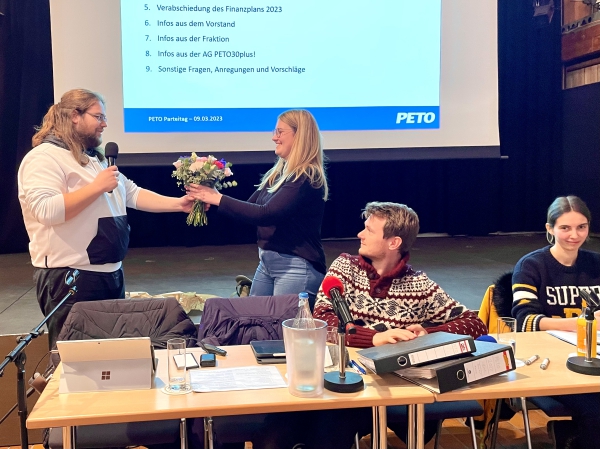 Auf ihrem Parteitag am vergangenen Donnerstag, den 9.3.2023 haben die Mitglieder der PETO einen neuen Parteivorsitzenden gewählt. Die knapp 40 anwesenden Mitglieder, die im Baumberger Bürgerhaus zusammen gekommen waren, votierten in geheimer Wahl einstimmig bei zwei Enthaltungen für Malte Franke. Der 26-jährige Baumberger gehörte dem Vorstand bereits seit acht Jahren als stellvertretender Vorsitzender an. Er folgt auf Lydia Hannawald, die das Amt der Vorsitzenden seit sechs Jahren ausgeübt hat. Aufgrund ihrer vielfältigen Verpflichtungen als stellvertretende Bürgermeisterin stellte Hannawald sich nicht mehr zur Wahl.