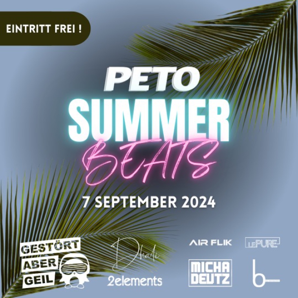 Zum zehnten Mal findet die Party unter dem Titel „Summerbeats“ statt. Bereits seit über 20 Jahren veranstaltet PETO jährlich eine Open-Air-Party auf der Baumberger Bürgerwiese. Und wieder einmal kommen mehrere Top-Künstlerinnen und Künstler auf die Bühne. Neben bester Musik warten Speisen und Getränke zu fairen Preisen auf die Besucherinnen und Besucher.